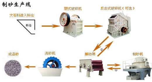 制砂生產(chǎn)線由振動給料機、破碎機、制砂機(細碎機)、洗砂機、振動篩和膠帶傳輸機等設備組合而成。用戶可根據(jù)不同的工藝要求,來自行進行組合,以滿足不同的工藝要求。