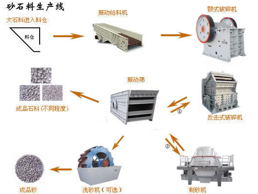 砂石生產(chǎn)線主要由振動給料機(jī)、鄂式破碎機(jī)、反擊式破碎機(jī)、振動篩、制砂機(jī)、洗砂機(jī)和膠帶輸送機(jī)備組合而成。用戶可根據(jù)不同的工藝要求,來自行進(jìn)行組合,以滿足不同的工藝要求。